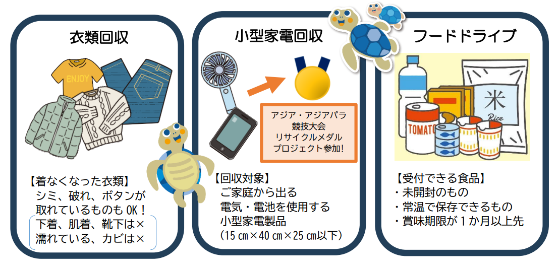 当日は、名古屋市環境局の「衣類」、「小型家電」、「フードドライブ」回収コーナーを設置します。